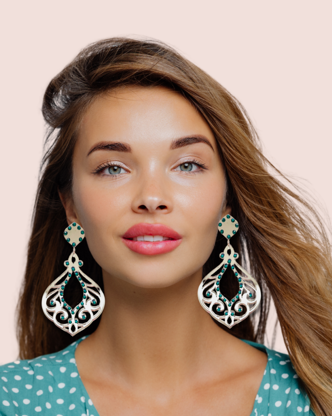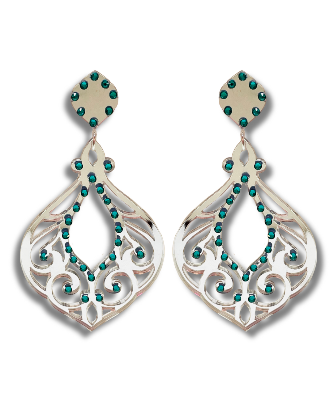 Materials: Silver mirror plexiglass, green rhinestones, snap closure in surgical steel (hypoallergenic).